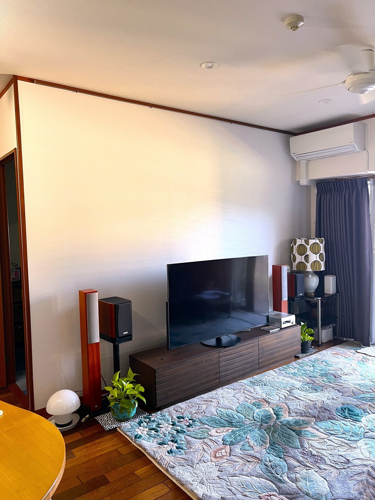 物置きとして使用されていたスペースをシアタールームにしたい!とのご依頼でした。天井がとても低いので、ライトは埋め込み式にしました。また、ホワイトベースのお部屋にすることで明るく、開放感を感じられます。窓がない部屋でしたので換気扇を新たに新設し、映画やカラオケを時間を気にせず楽しめるスペースになりました。