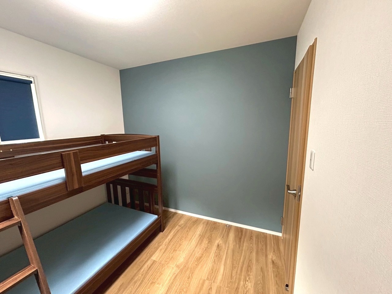一つの部屋を間仕切りし、お子様の個室を新たに設けました。壁はブルグレーで仕上げ、落ち着いたトーンの中にやさしさを感じる空間に。成長に合わせて長く使える、シンプルで居心地のよいこども部屋が完成しました。