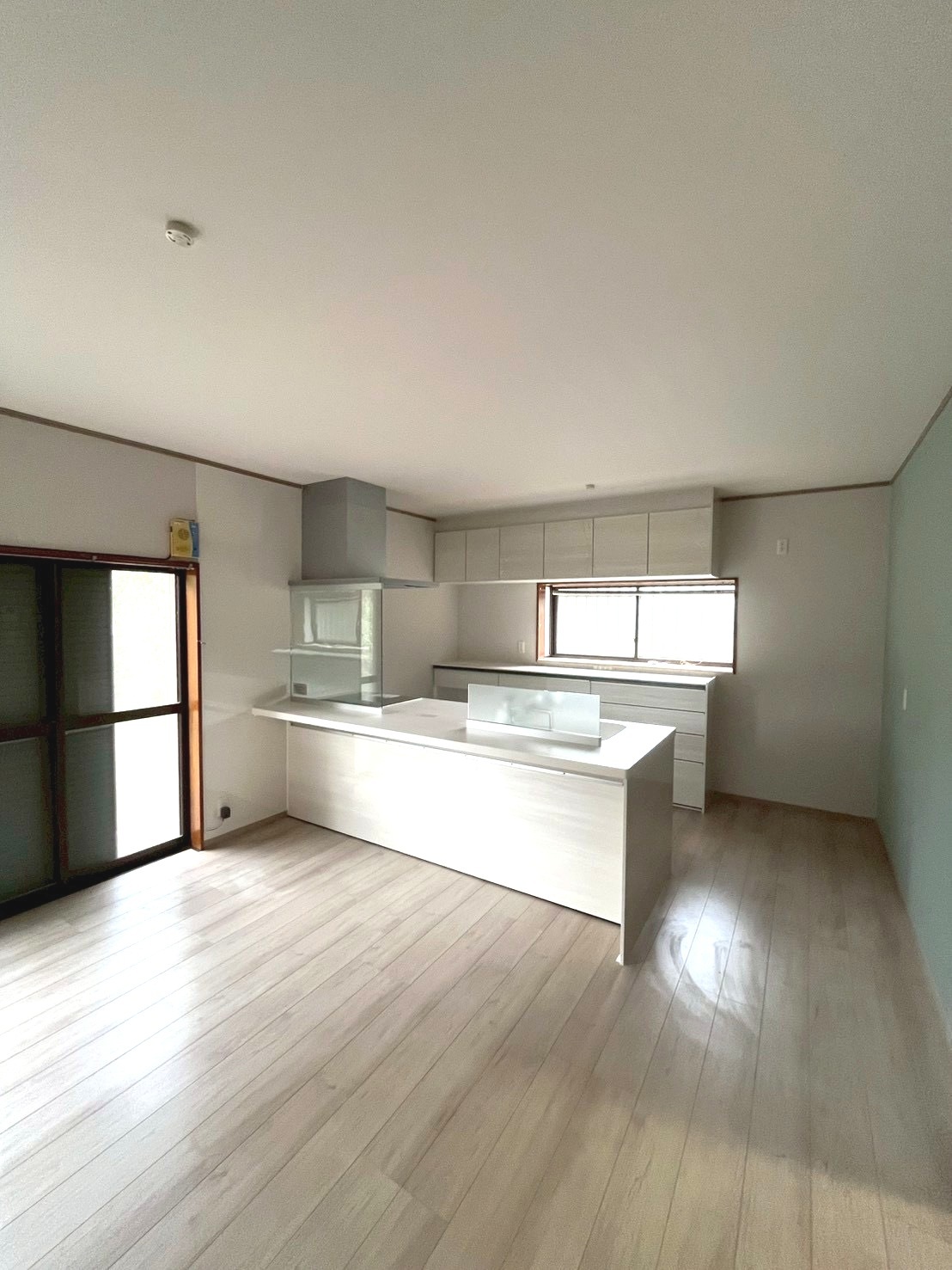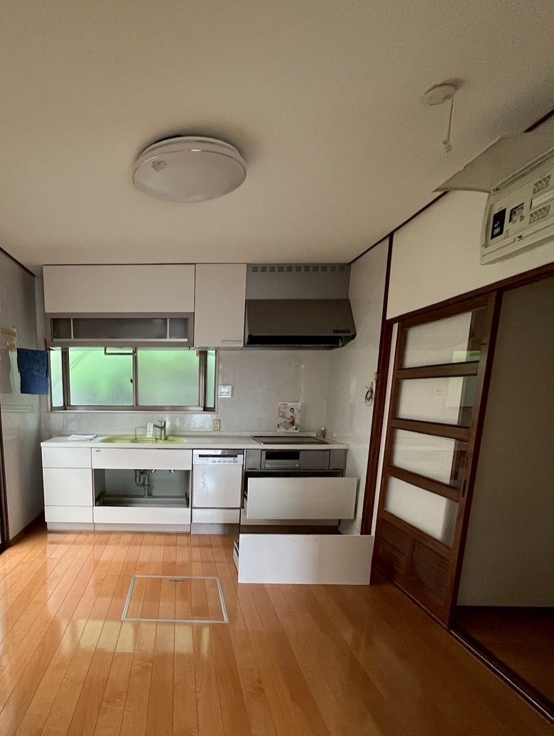 閉鎖的で独立したキッチンをオープンキッチンに!家族との会話がより弾むような明るい空間になりました。暗い色の劣化し剥がれかけたフローリングを明るいカラーにトーンアップしたことで、空間に広がりが生まれ、開放感と清潔感を感じられるようになりました。木目調のキッチンとも相性抜群でおしゃれです。※構造上・耐震上の都合上、鉄骨は残したまま施工しております。