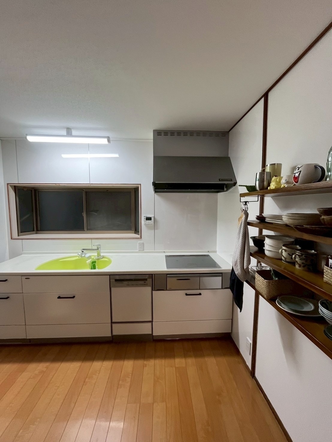 また、引き戸があった部分を間仕切って壁に変更し、お客様のオーダーサイズに合わせた棚を造作。収納力と使い勝手を高めながら、空間をより広く有効活用できるキッチンへと生まれ変わりました。