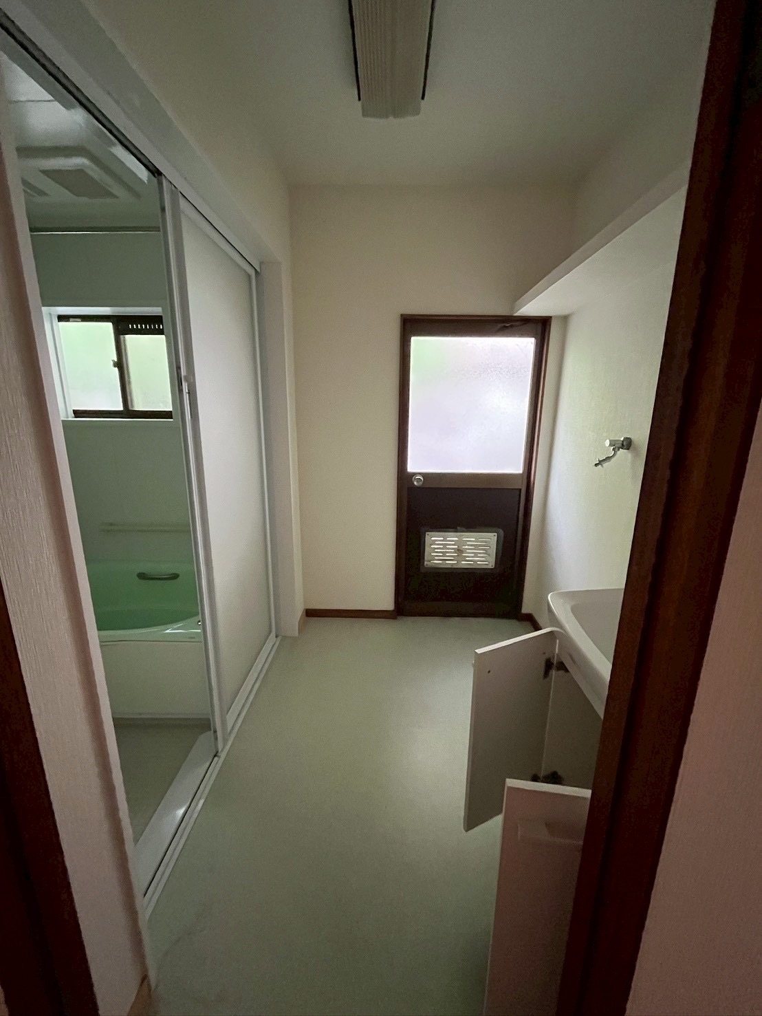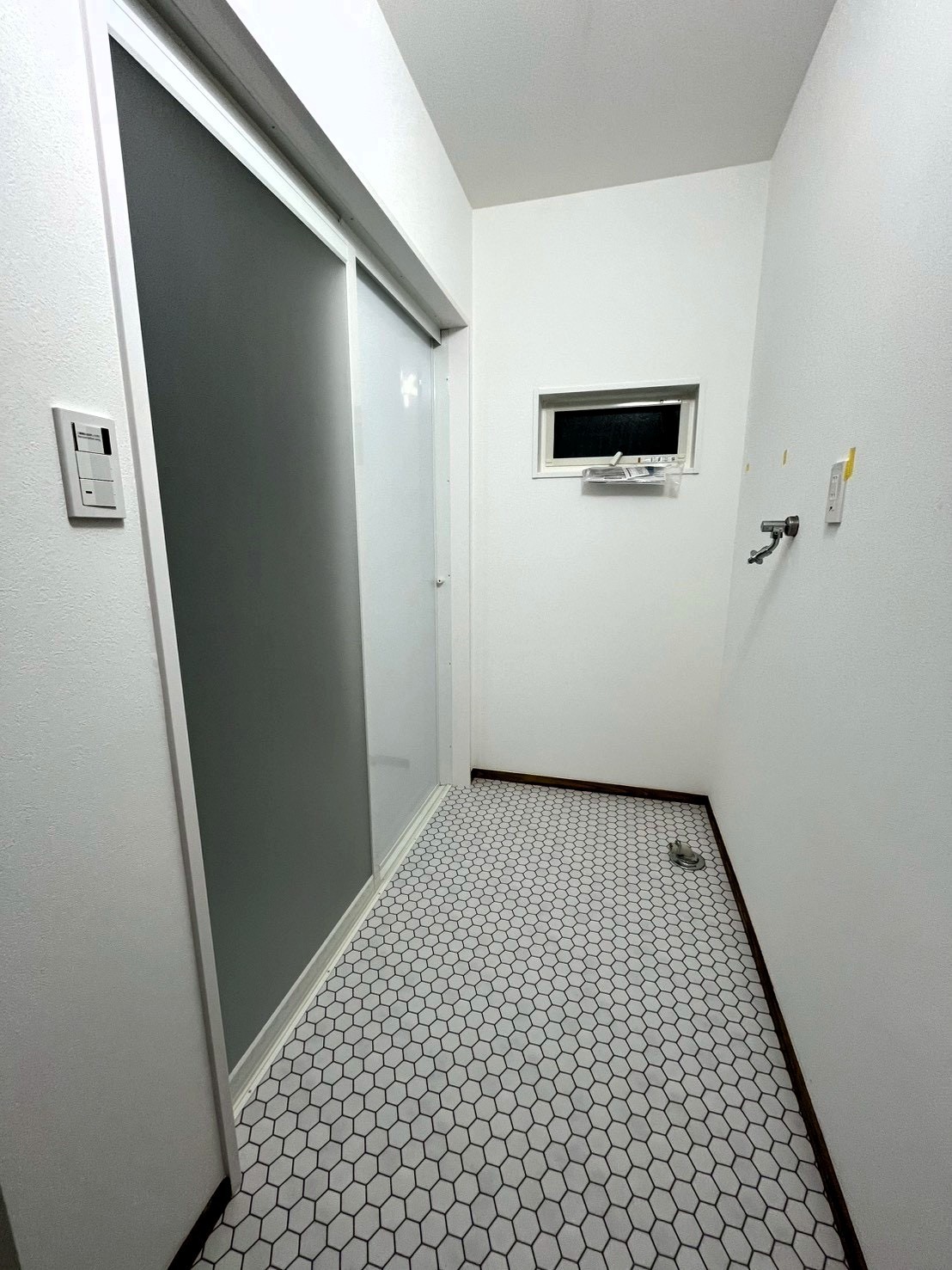 また、浴室と脱衣所の窓はサイズをコンパクトに変更。断熱性・清掃性を高めるとともに、防犯面にも配慮しました。もともと脱衣所にあった洗面台は撤去し、空間をすっきりと確保。さらに、これまで廊下として使われていたスペースを活用して新たに洗面スペースを設けることで、ゆとりある動線へと再構築しました。
