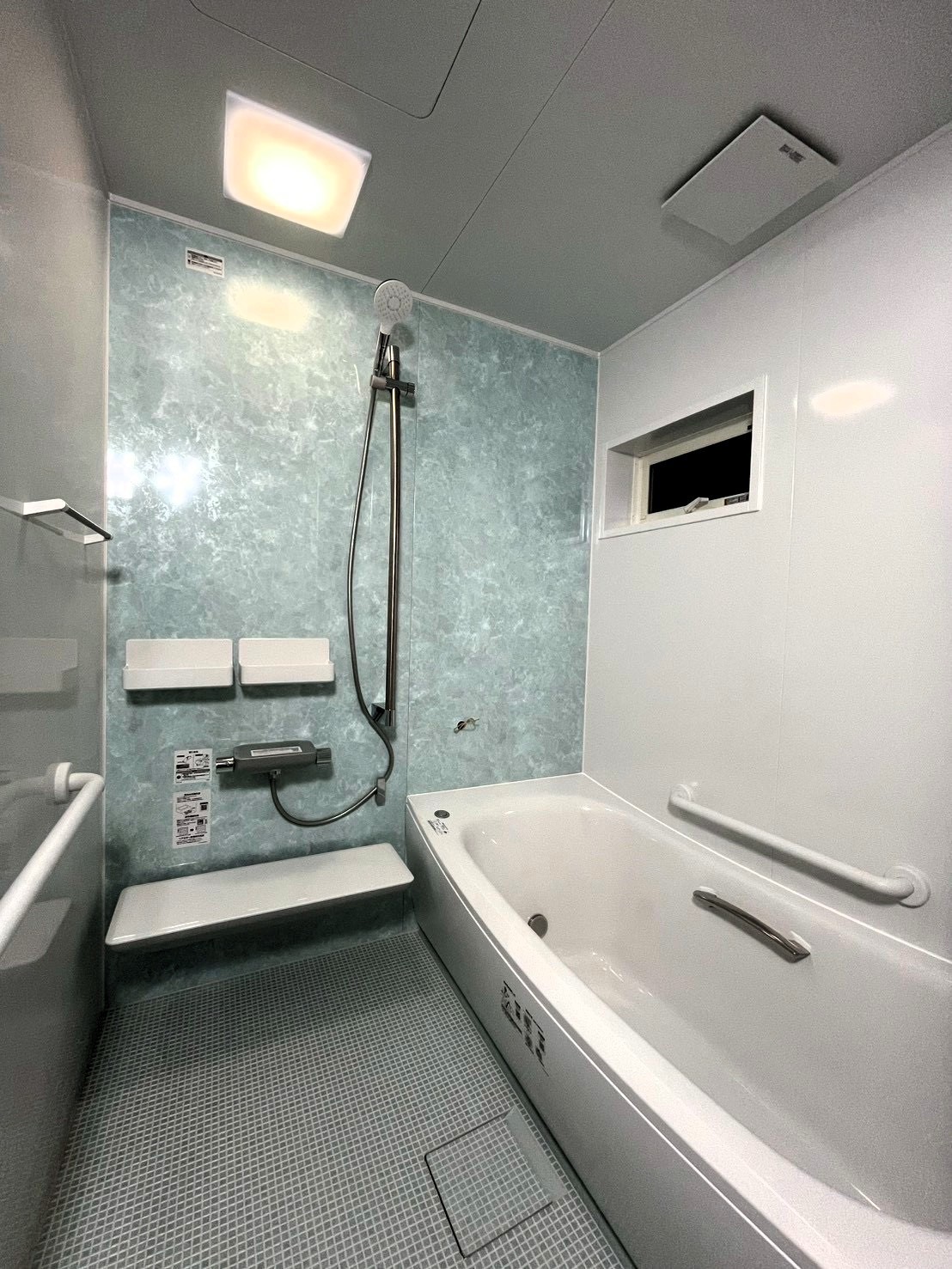 大理石調の壁がおしゃれ! 白を基調としたシンプルなバスルームになりました!小さめの窓からは優しい光が差し込みます。