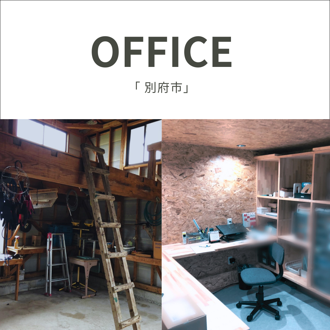 ロフトがある倉庫をオフィスにしました。二階の床部分を広げる工事を行い、壁と天井にはOSB合板を施工。事務スペースには職人の造作棚を設置。お客様の使い勝手に合わせてサイズ調整を行う完全オーダー品です。外は、元々の倉庫の窓を玄関に変更、屋根付きのBBQスペースを増設しました。