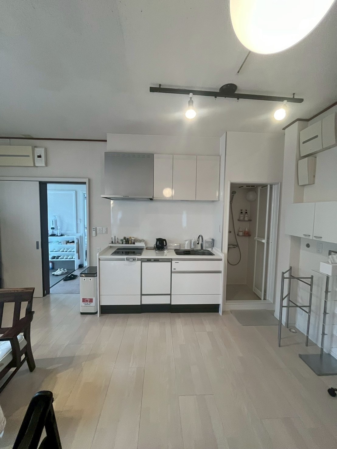 左に壁付キッチンと奥にシャワーブース