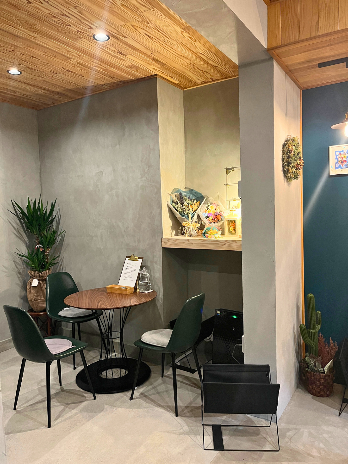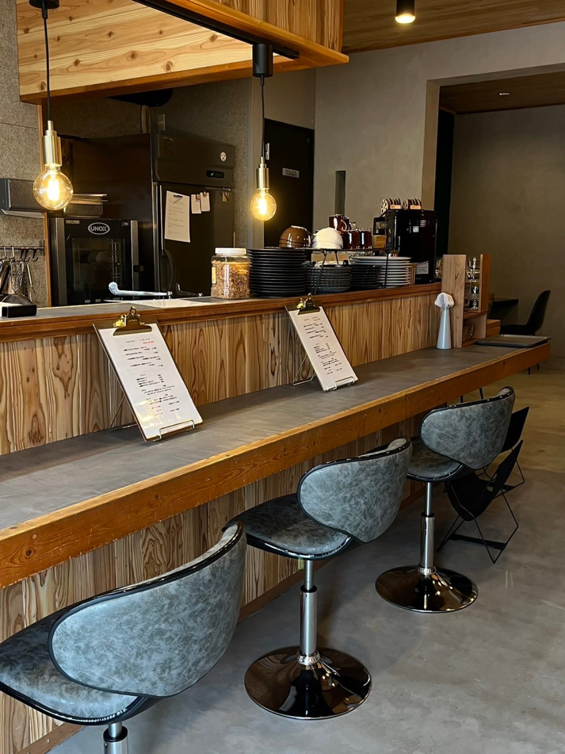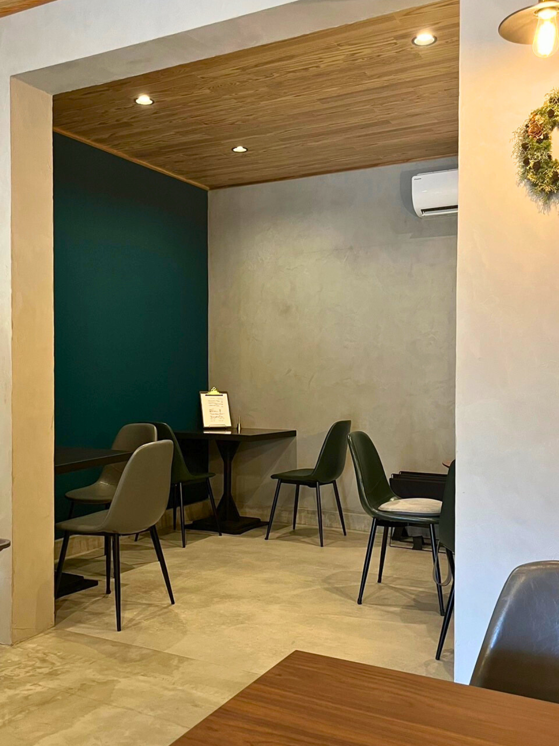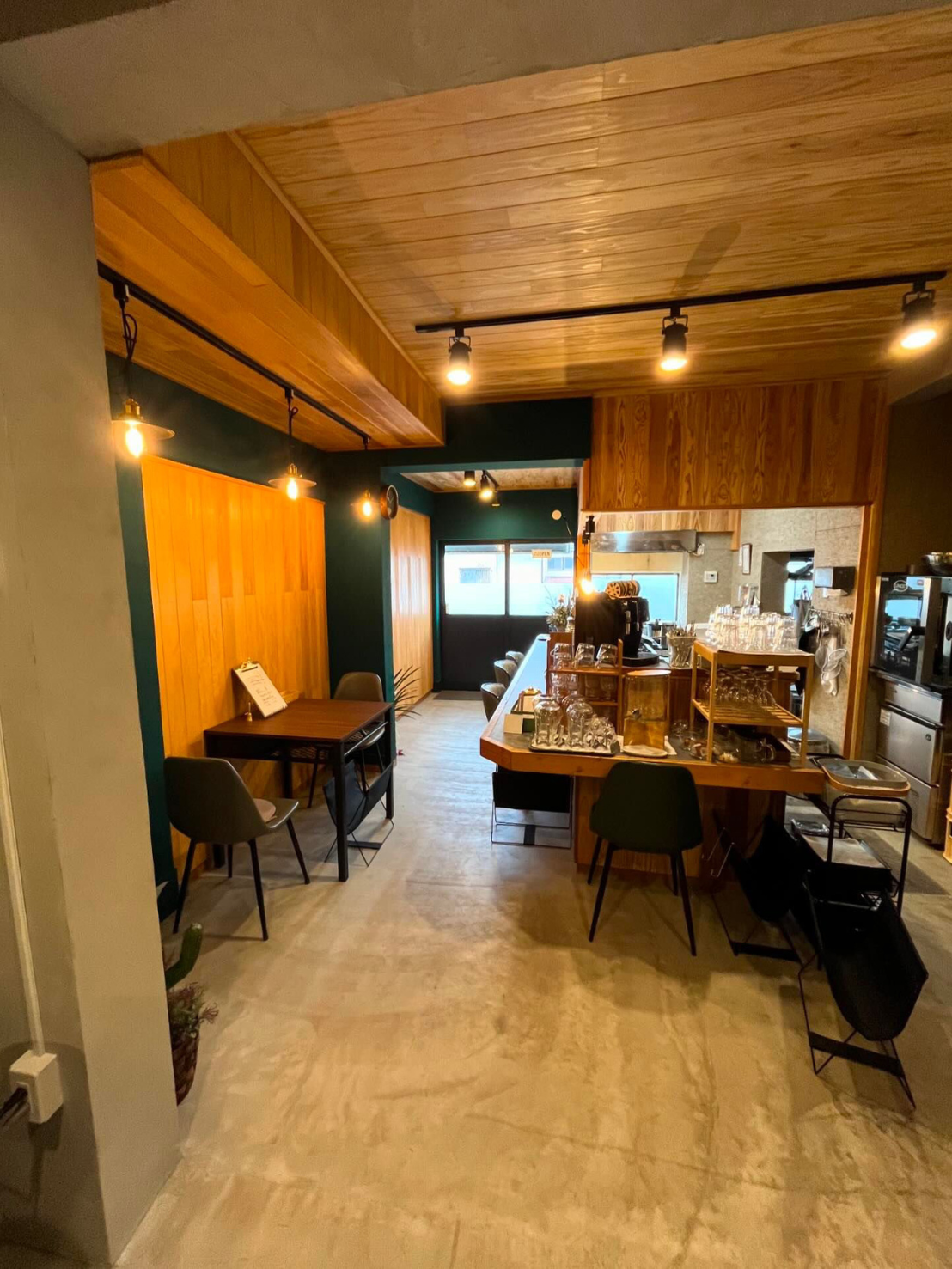 ビフォーは、住宅感が残るレトロな風合いの飲食店でした。メインの資材として、対照的な『モルタル』と『国産杉』を使用。無機質なスタイリッシュさと、どこかほっとするカフェ独特のスローな雰囲気を演出しました。オーナーのこだわりとあそび心が感じられるおしゃれなカフェです。お料理はとっても美味しく、デザートは絶品です。是非、足を運んでみてください。