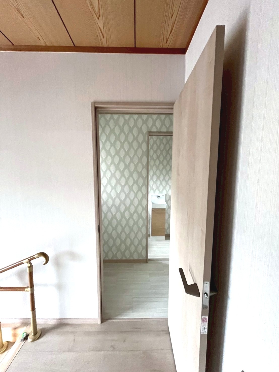 まるで別空間のような仕上がりになりました!床には木目調のクッションフロア、壁にはアクセントにグリーンのクロスを施工しました。