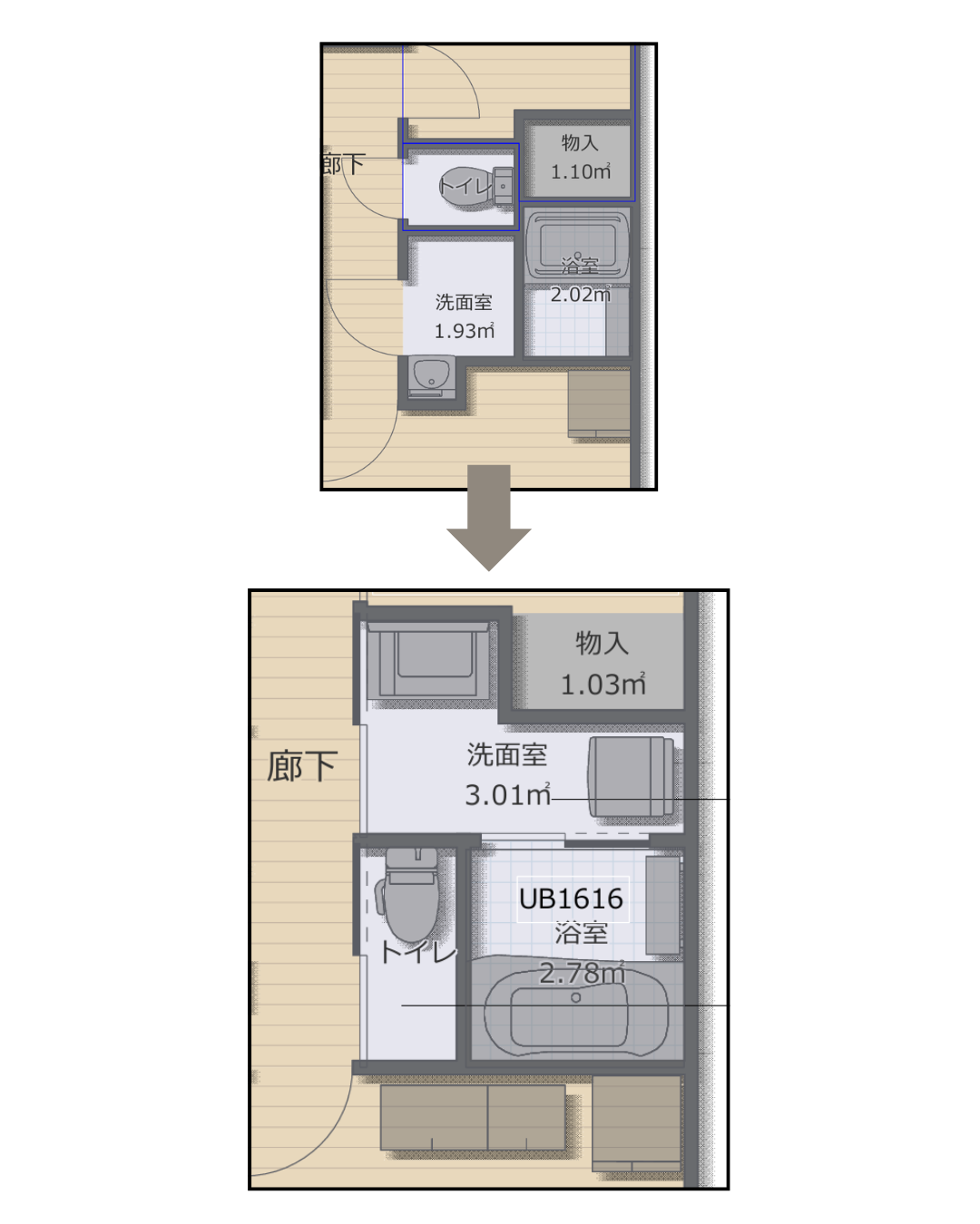 水回り全体の間取りを見直し、より使いやすく、ゆとりのある空間へとアップデートしました。ファミリー層を想定し、動線を整理することで、朝の混み合う時間帯でもストレスなく使える配置に。独立したトイレ空間にすることで、プライバシー性も向上しています。